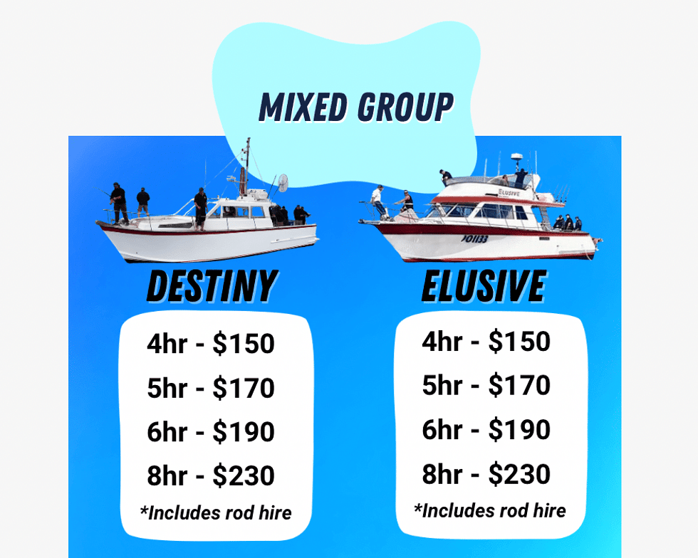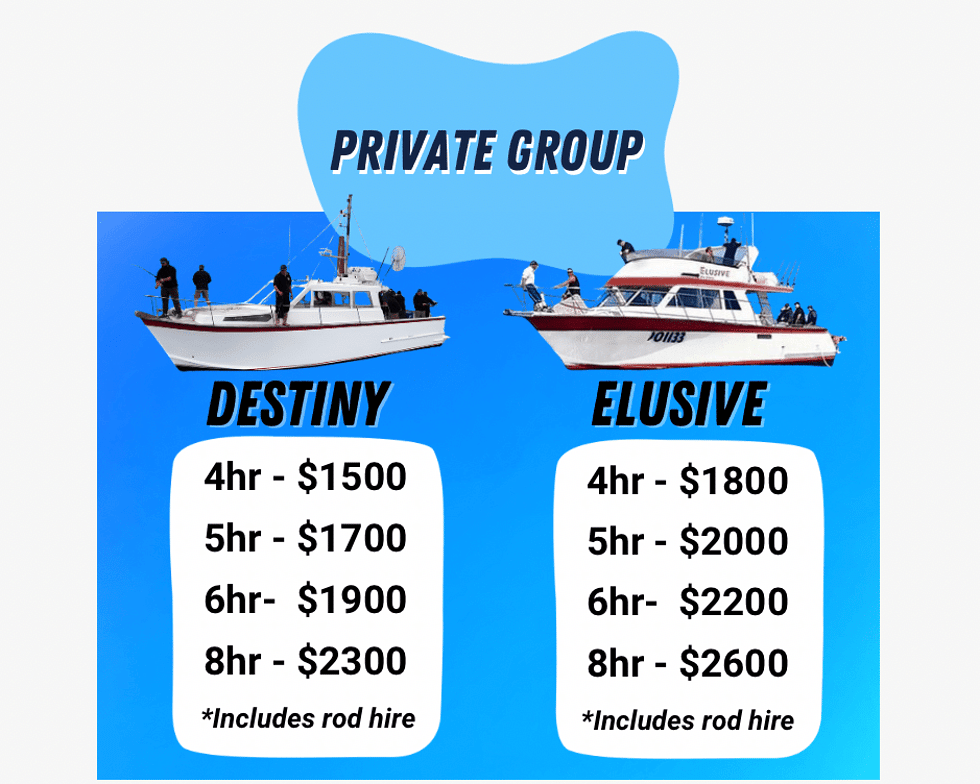 Charters include bait, tackle, tea, coffee, water and snacks. A light lunch will be provided for 6hr and 8hr charters. Toilet facilities on board.